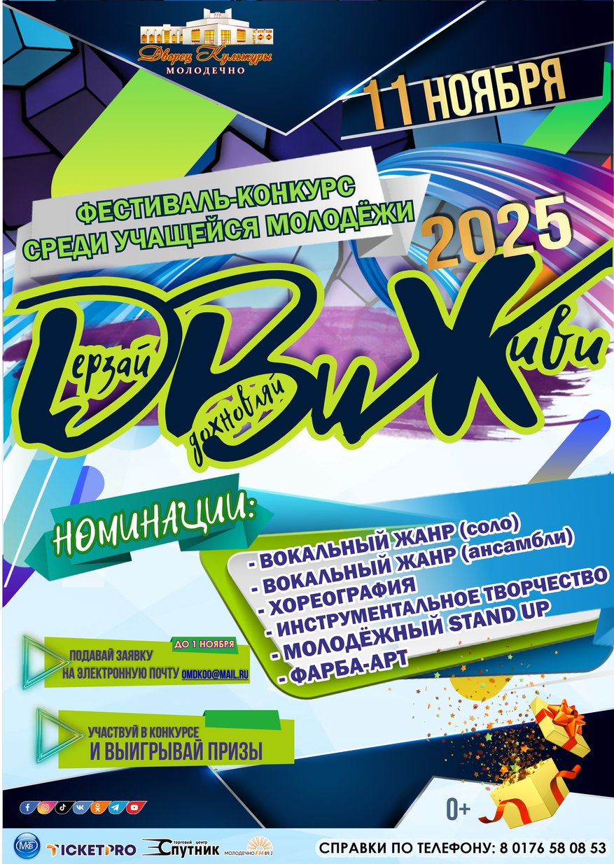 01.11.2025Приглашаем принять участие в районном фестивале-конкурсе среди учащейся молодёжи «ДВиЖ -2025» — Дерзай, Вдохновляй и Живи!