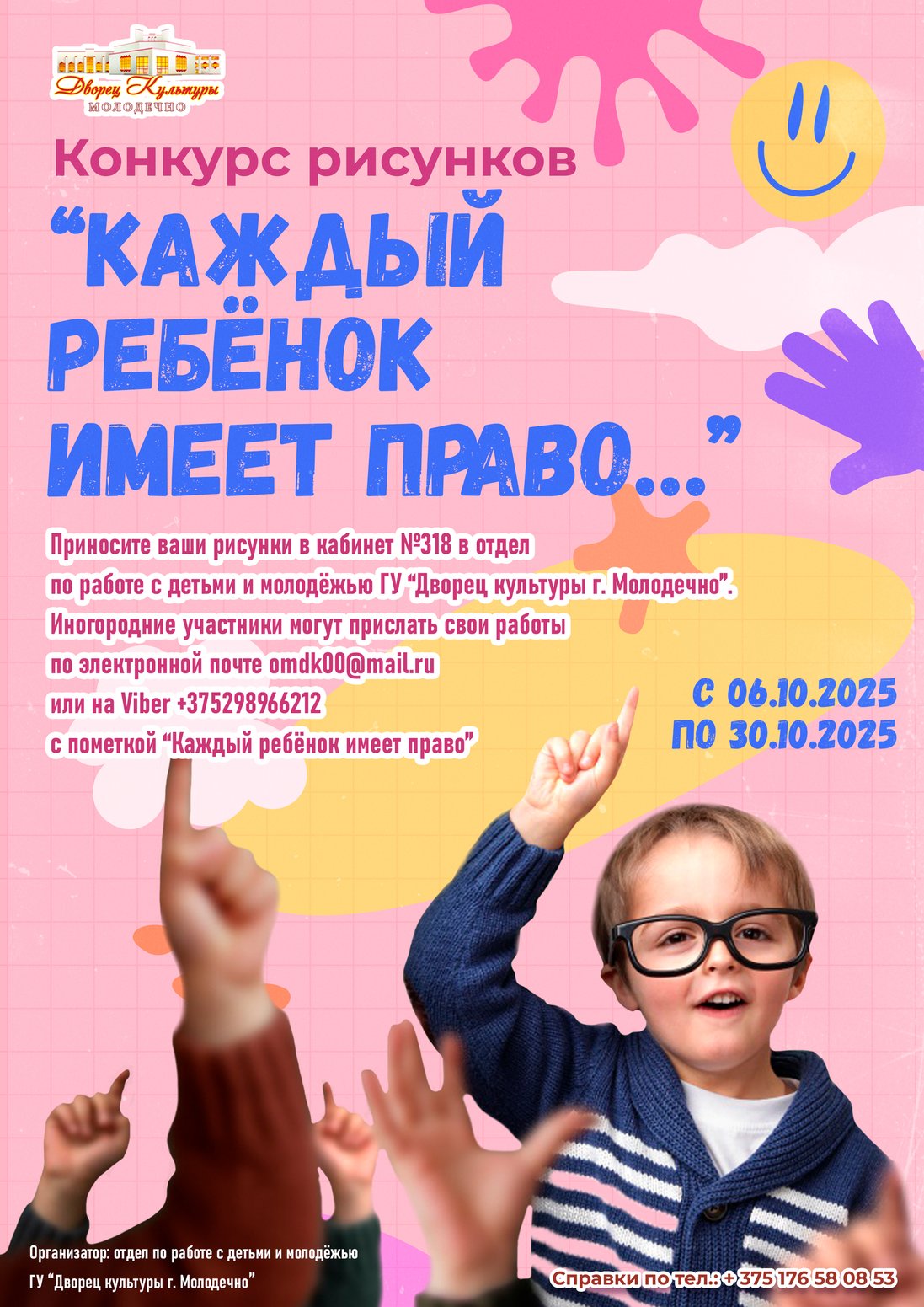 06.10.2025Дворец культуры г. Молодечно проводит конкурс рисунков «Каждый ребёнок имеет право…».