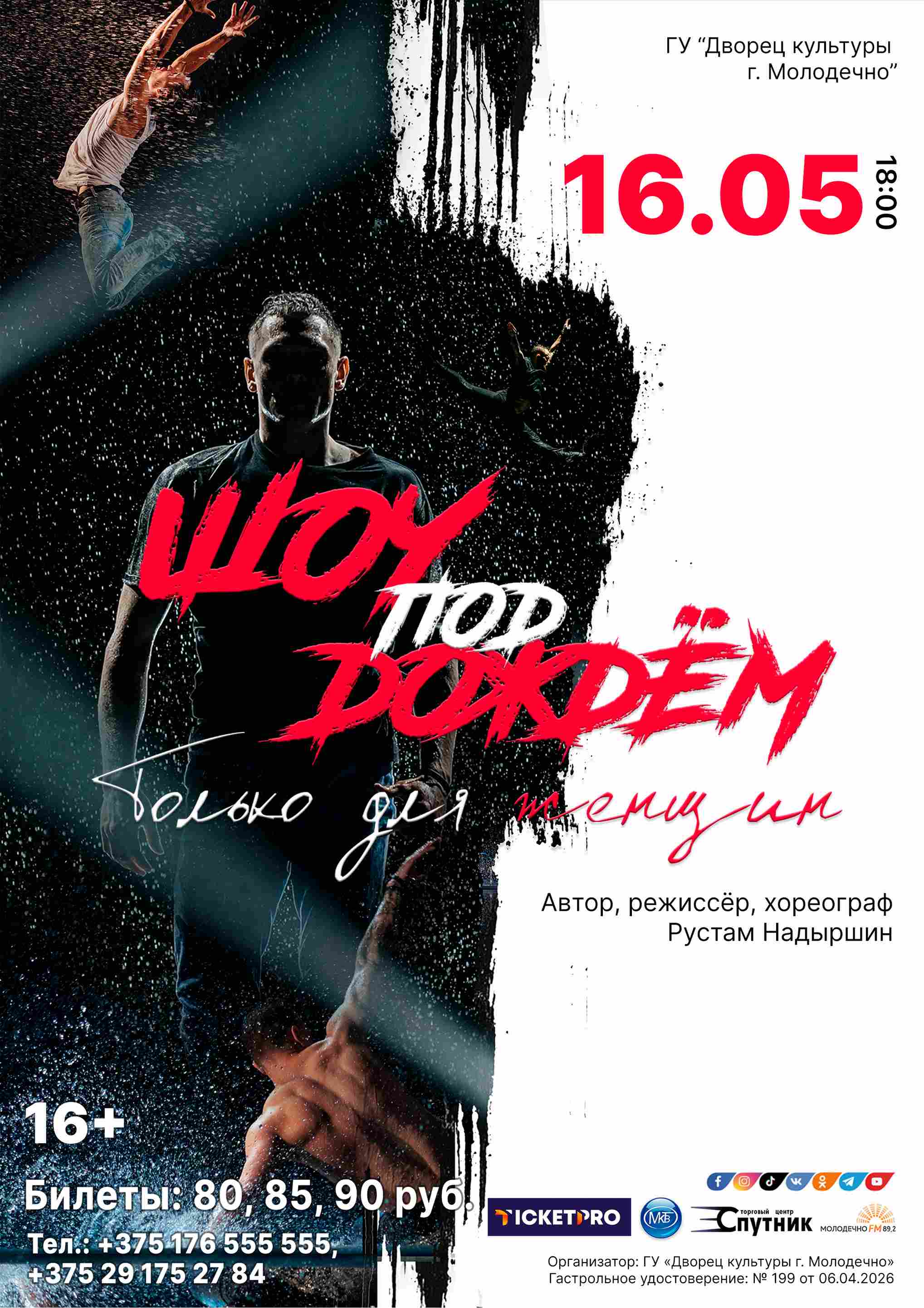 16.05.2026Дворец культуры г. Молодечно приглашает 16 мая на шоу под дождём «Только для женщин» Санкт-Петербургского театра танца «Шторм» (Российская Федерация).