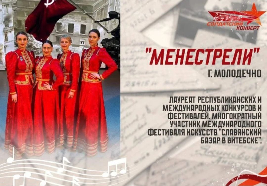 07.05.2024Со 2 по 16 мая в стране пройдут региональные отборочные туры вокалистов для участия в Национальном фестивале-конкурсе патриотической песни «Солдатский конверт – 2024», посвященном 80-летию освобождения Республики Беларусь от немецко-фашистких захватчиков.