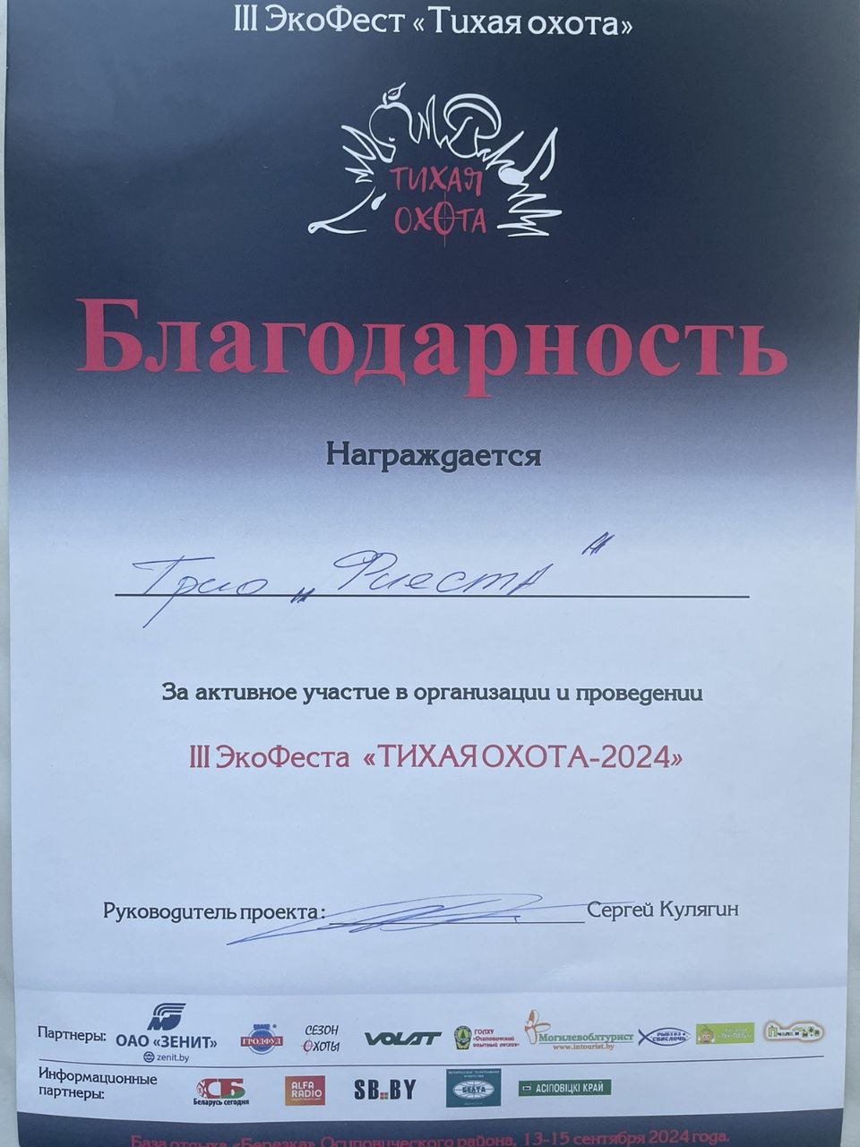 Партнерами ІІІ ЭкоФеста «Тихая охота – 2024» выступили ОАО «Зенит», туристическое агентство «Могилёвоблтурист», МЗКТ «VOLAT», Издательский дом «Беларусь сегодня» и др.