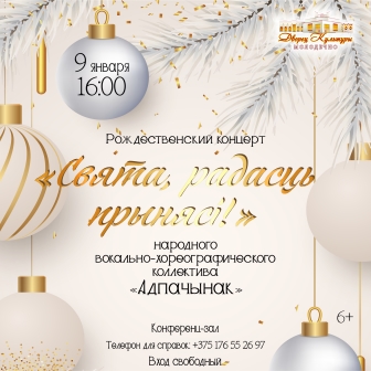 08.01.2025В рамках Республиканской акции для пожилых людей «От всей души!» во Дворце культуры города Молодечно 9 января состоится рождественский концерт «Свята, радасць прынясі!» народного вокально-хореографического коллектива «Адпачынак».