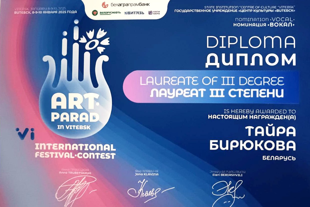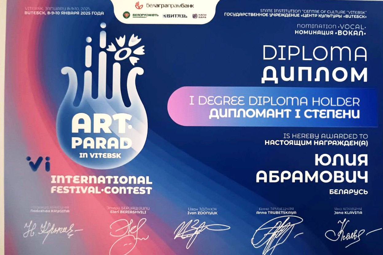 Выступление молодечненских вокалисток среди более тысячи талантливых конкурсантов со всего мира в очередной раз подтвердило их высокий уровень подготовки и мастерства: в номинации «Вокал» Юлия Абрамович (руководитель – Александр Важник) возвращается домой с дипломом I степени, а юная Тайра Бирюкова (руководитель – Алеся Важник) стала лауреатом III степени «Арт-парада в Витебске»!