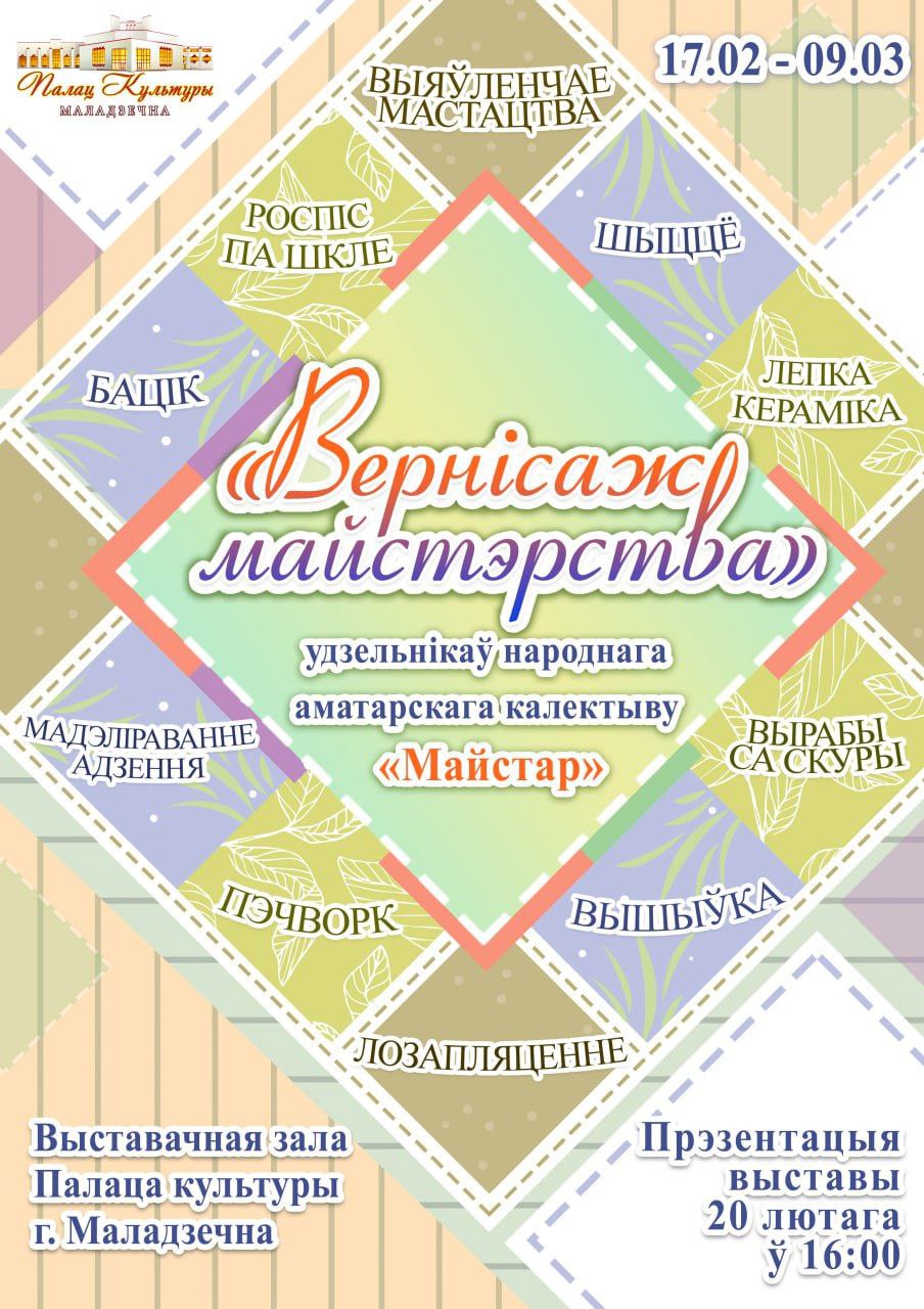 17.02.2025Дворец культуры г.Молодечно приглашает окунуться в мир вдохновения и творчества, созданный талантливыми мастерами народного любительского коллектива «Майстар», и посетить «Вернісаж майстэрства»!