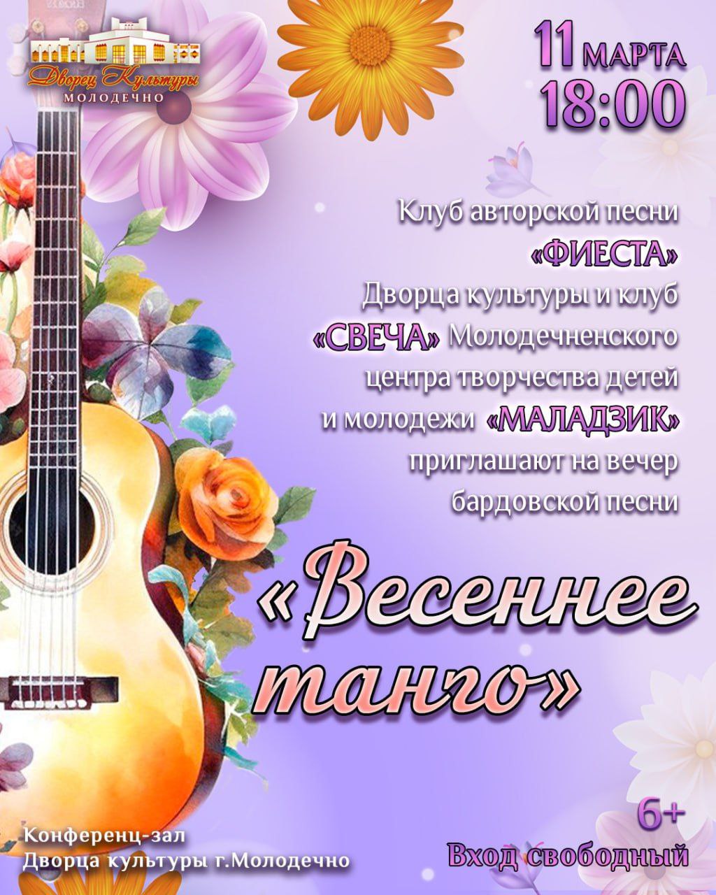 09.03.2025Клуб авторской песни «Фиеста» Дворца культуры г.Молодечно и клуб «Свеча» Молодечненского центра творчества детей и молодёжи «Маладзик» приглашают на вечер бардовской песни «Весеннее танго»!