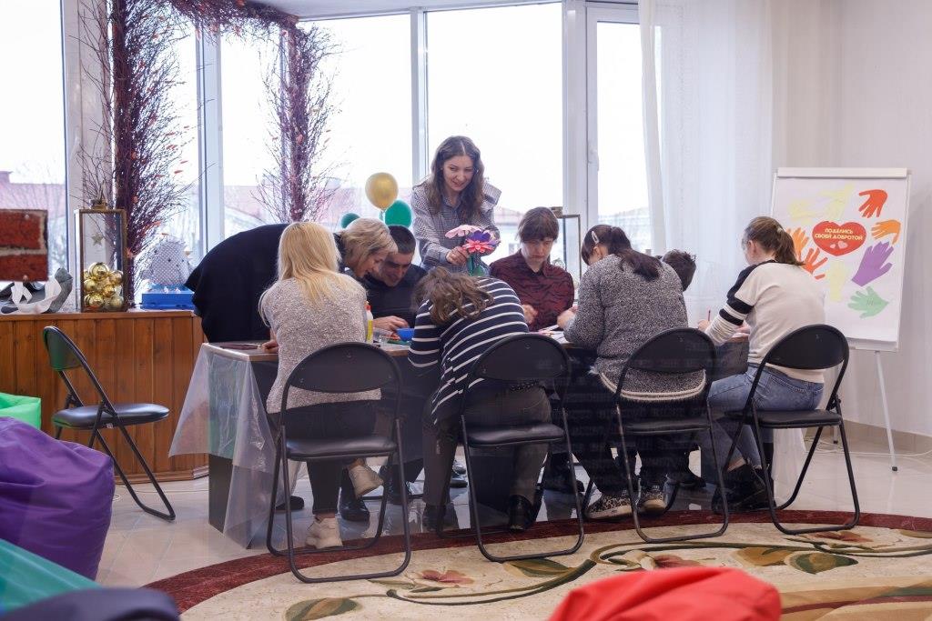 Эта встреча стала путешествием в мир красок, текстур и безграничной фантазии. Под руководством Светланы Серёгиной участники – люди разного возраста и с различными особенностями в развитии – создавали из фетра, фоамирана и разноцветных пуговиц невероятной красоты декоративные цветы.
