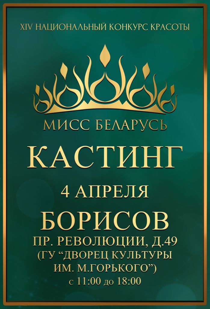 04.04.2025Приглашаем талантливых и уверенных в себе девушек принять участие в региональном этапе Национального конкурса красоты «Мисс Беларусь», который состоится в г. Борисове. Это уникальная возможность проявить себя, продемонстрировать свои лучшие качества и, возможно, стать частью яркого мира красоты и успеха!