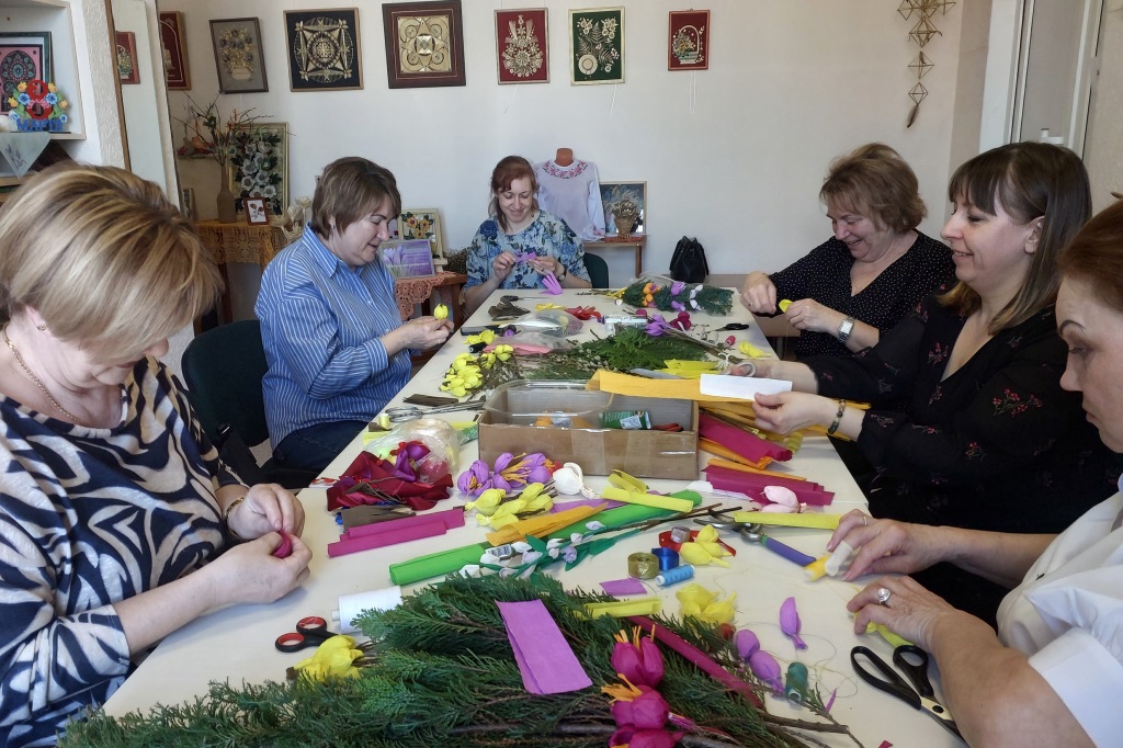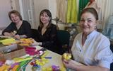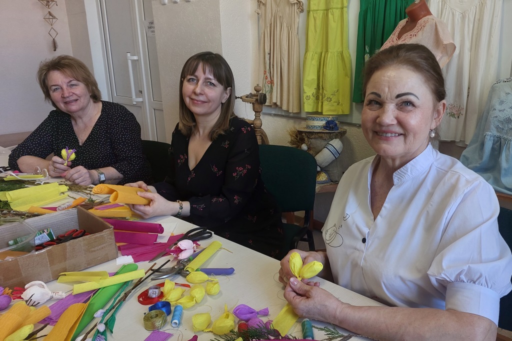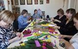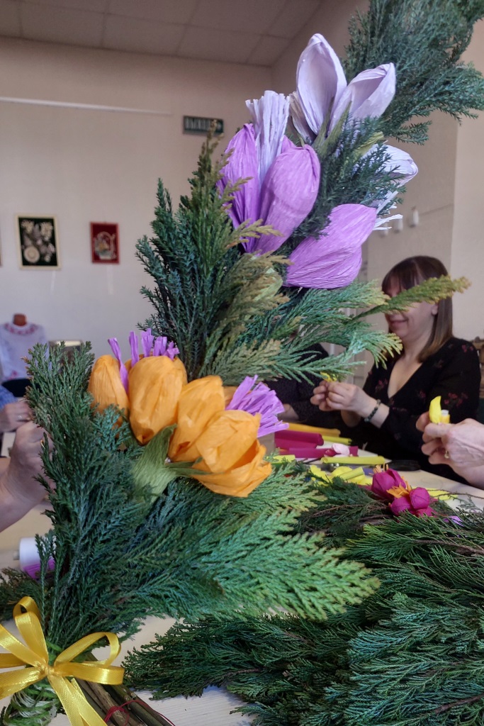 Сначала из плотной гофрированной бумаги сделали разноцветные лепестки. Для каждого изделия их понадобилось около трёх десятков. Затем собрали из них нежные весенние крокусы, которыми вместе с веточками вечнозеленой туи украсили свои работы. Заодно прошёл и сеанс ароматерапии, ведь туя издает такой чудесный запах, выделяет полезные фитонциды. По ходу занятия мастера центра ремёсел делились своими секретами: учили скручивать лепестки, сердцевины цветков, скреплять их нитками, быстро вязать узелки.
