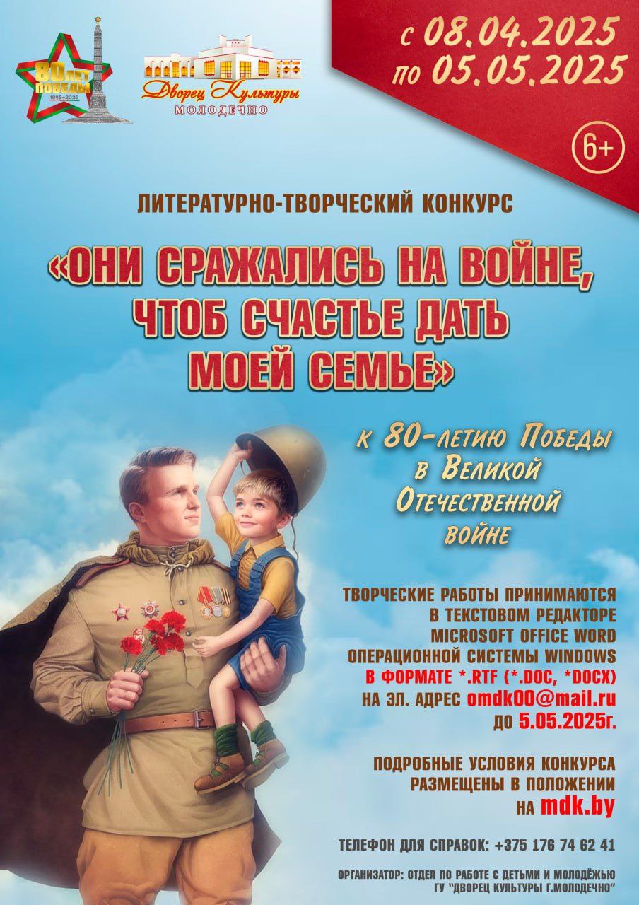 08.04.2025С 8 апреля по 5 мая 2025 года в Молодечно пройдёт литературно-творческий конкурс «Они сражались на войне, чтоб счастье дать моей семье», посвящённый 80-летию Великой Победы. Отдел по работе с детьми и молодёжью Дворца культуры г. Молодечно приглашает всех, кому дорога память о героях войны, принять участие в этом конкурсе.
