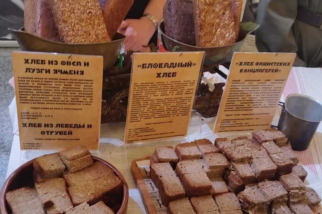 Уже в фойе ощущалась атмосфера скорби и памяти. Тематические выставки, и особенно блокадный хлеб – 125 граммов надежды и выживания – погружали в трагическую эпоху.