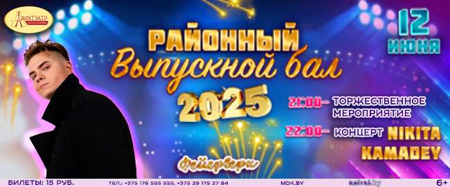 05.06.2025В рамках районного торжественного мероприятия «Выпускной бал-2025», который состоится в Молодечно 12 июня, в 22.00 в Амфитеатре выступит с концертной программой артист Никита КамадЭй.