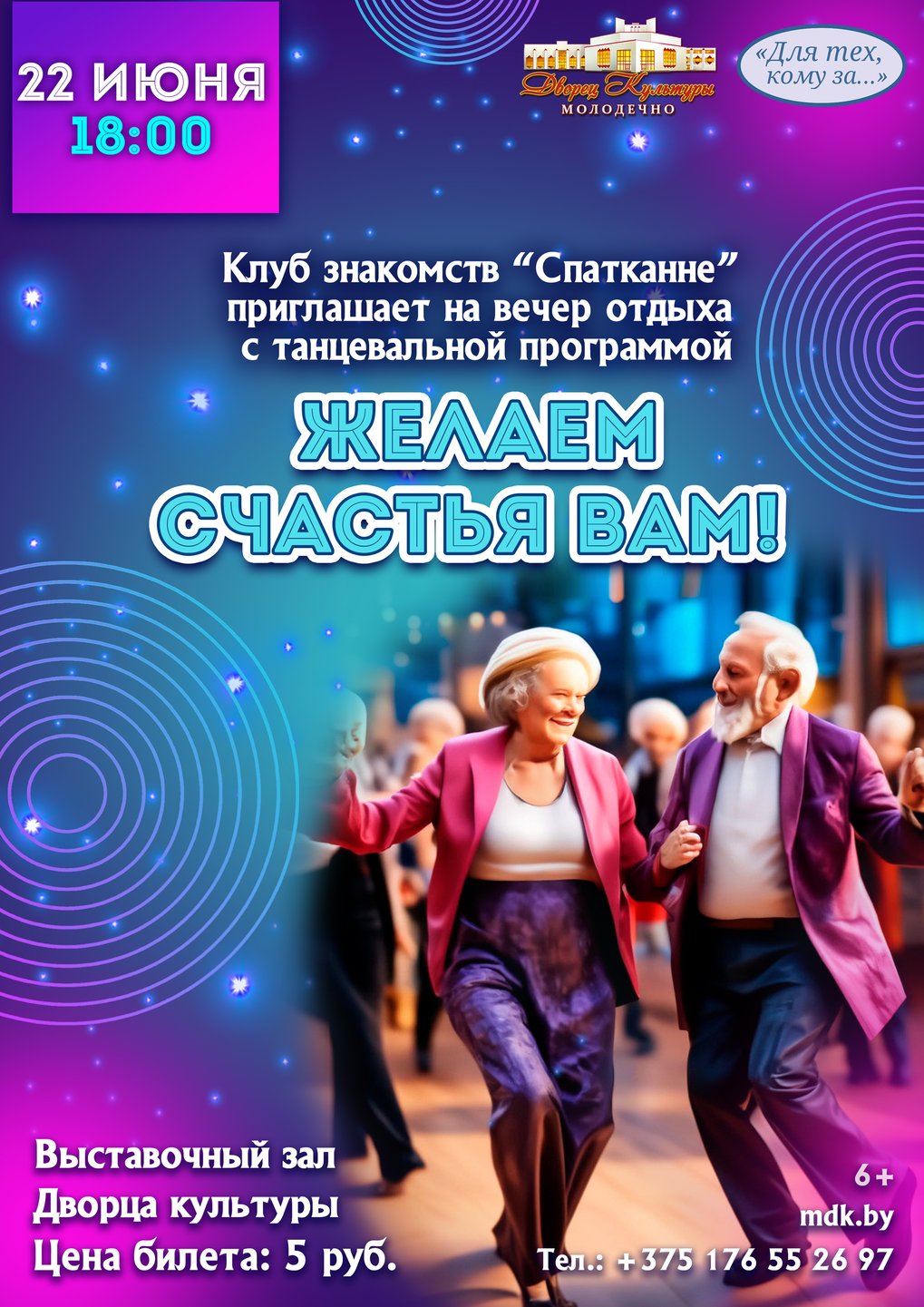 20.06.2025Клуб знакомств «Спатканне» Дворца культуры г. Молодечно приглашает 22 июня на вечер отдыха «Желаем счастья вам!».