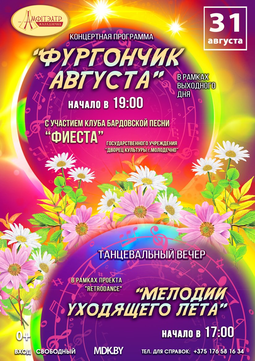 Последний день уходящего лета продолжит концертная программа «Фургончик августа» клуба бардовской песни «Фиеста» Дворца культуры г. Молодечно. Она начнётся в 19.00 и станет ярким событием для меломанов.
