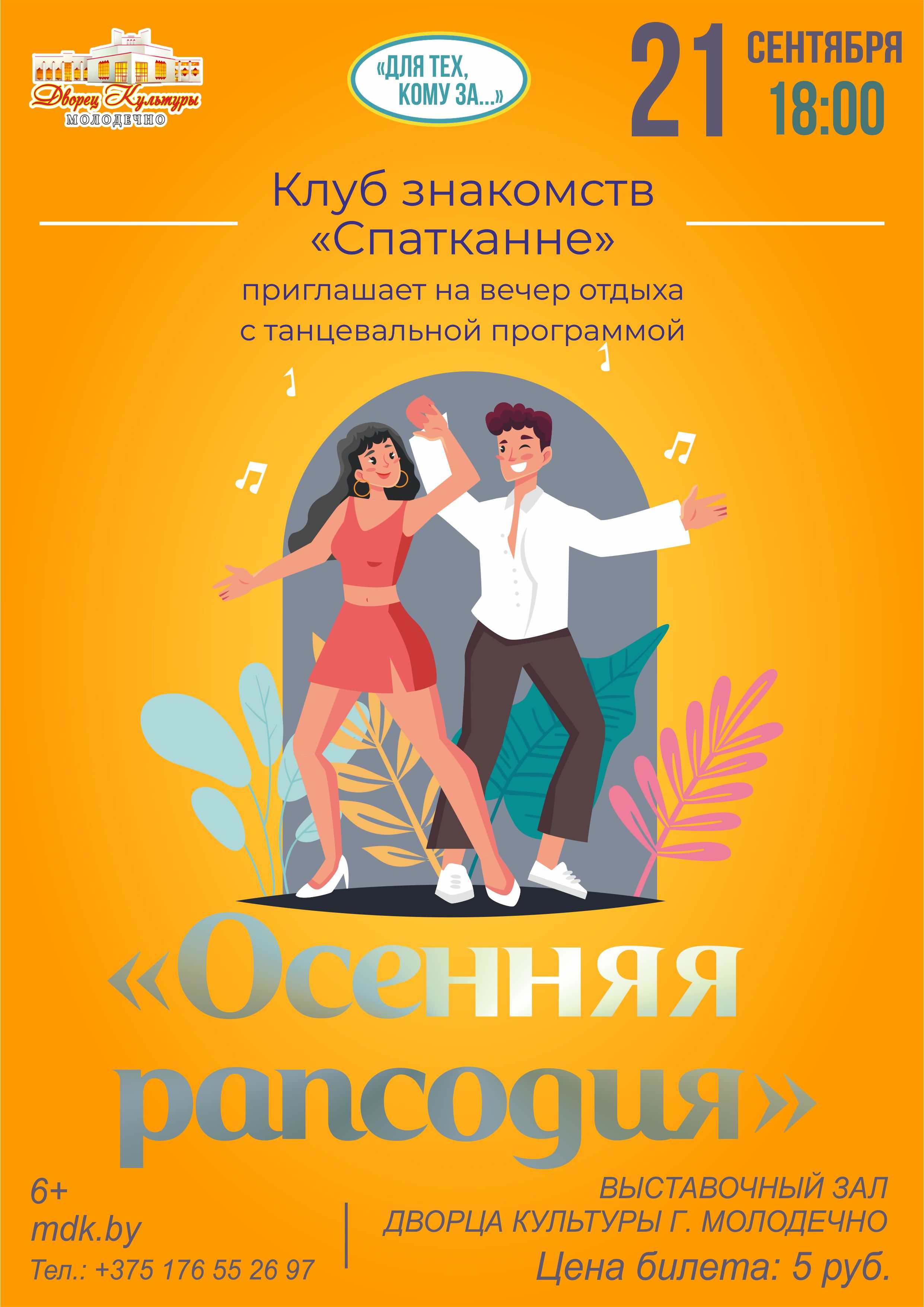 21.09.2025Клуб знакомств «Спатканне» Дворца культуры г. Молодечно приглашает 21 сентября на вечер отдыха с танцевальной программой «Осенняя рапсодия»!
