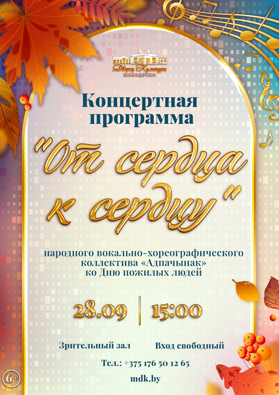 17.09.2025Дворец культуры г. Молодечно приглашает на концертную программу «От сердца к сердцу» вокально-хореографического коллектива «Адпачынак», посвящённую Дню пожилых людей!