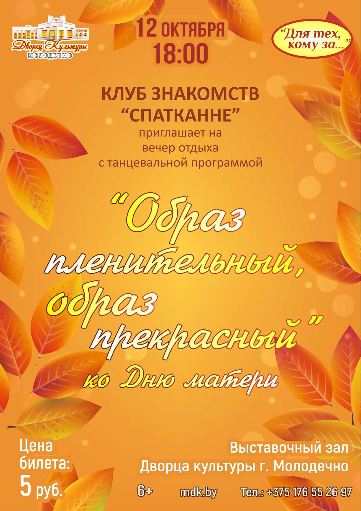 06.10.2025Клуб знакомств «Спатканне» Дворца культуры г. Молодечно приглашает на душевный вечер отдыха с танцевальной программой «Образ пленительный, образ прекрасный». Он будет посвящён Дню матери.