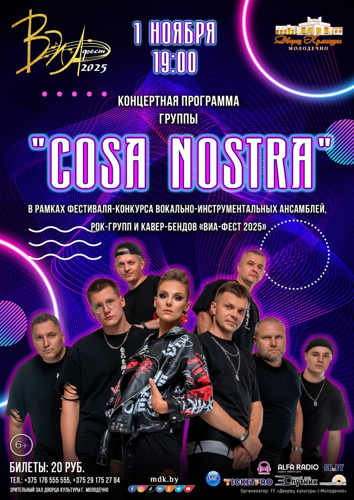 15.10.2025Во Дворце культуры г. Молодечно 1 ноября состоится концертная программа группы «Cosa Nostra». Она пройдёт в рамках фестиваля-конкурса вокально-инструментальных ансамблей, рок-групп и кавер-бендов «ВИА-Фест 2025».