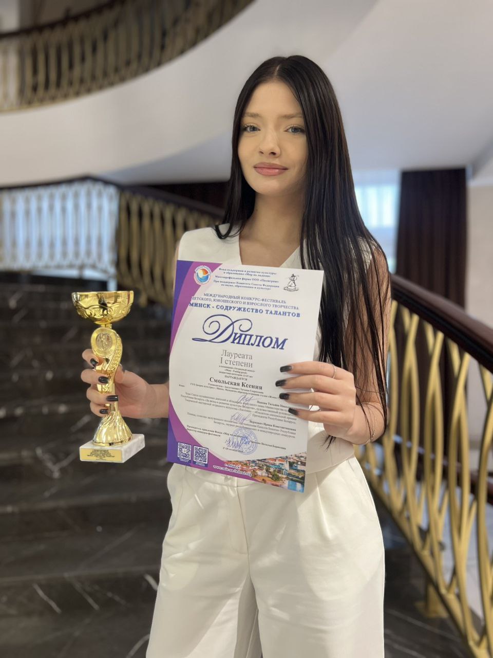 29.10.2025Поздравляем участницу образцовой эстрадной студии «Жывы гук» Дворца культуры г. Молодечно Ксению Смольскую и ее педагога Татьяну Генриховну Августинович с высокой наградой: юная вокалистка стала обладательницей диплома лауреата І степени Международного конкурса-фестиваля детского, юношеского и взрослого творчества «Минск – содружество талантов». Девушка выступала в номинации «Эстрадный вокал» в возрастной категории 13 – 15 лет.