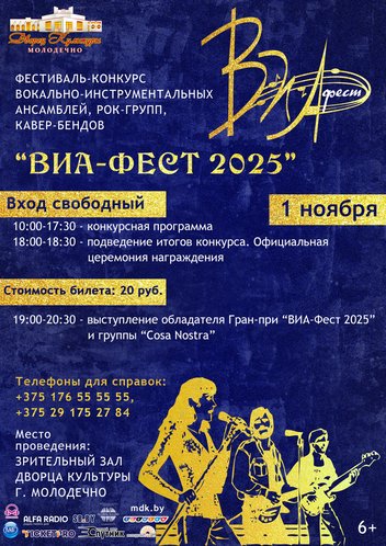 31.10.2025Во Дворце культуры г. Молодечно 1 НОЯБРЯ 2025 года состоится Фестиваль-конкурс вокально-инструментальных ансамблей, рок-групп и кавер-бендов «ВИА-ФЕСТ 2025».