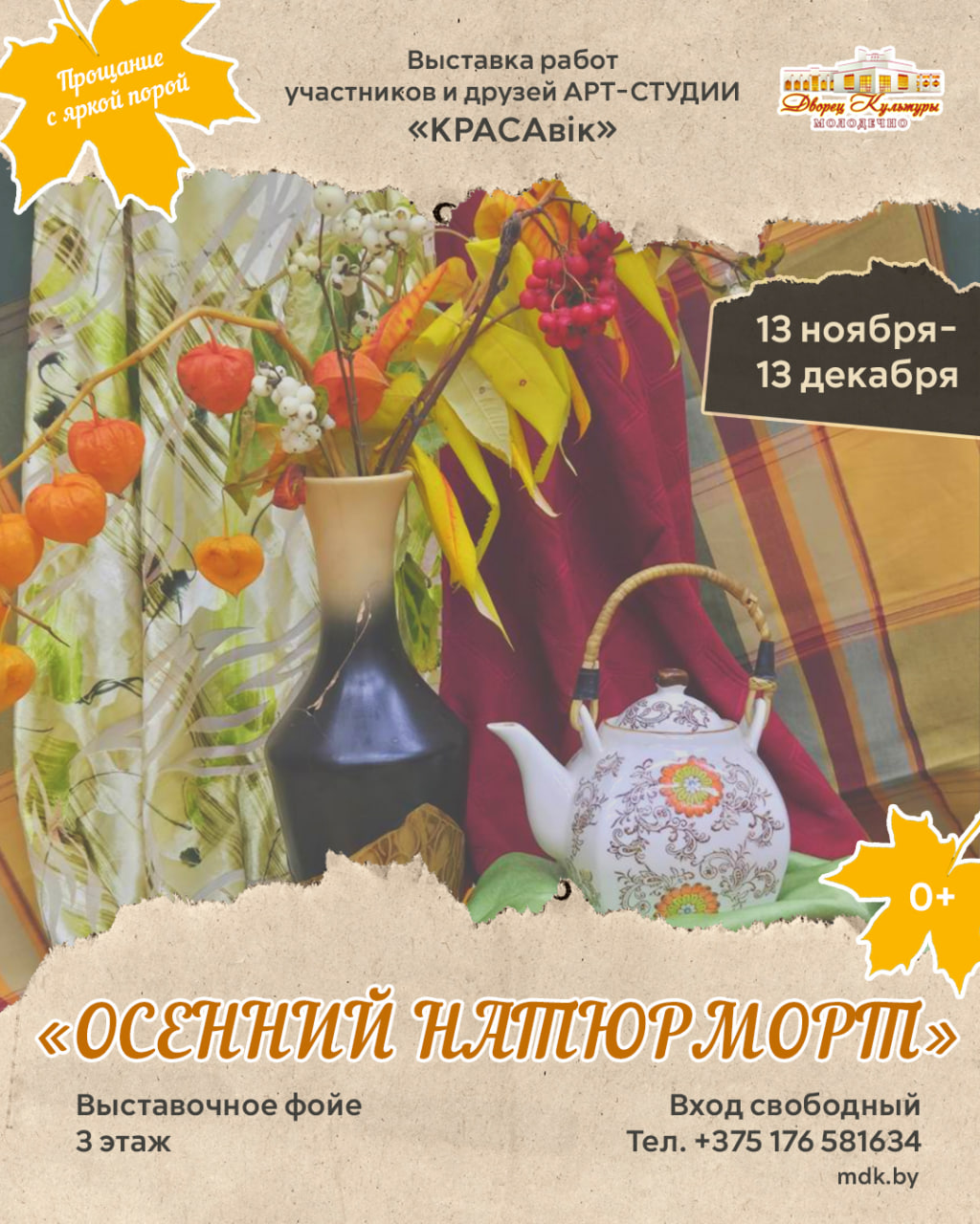 13.11.2025Приглашаем жителей и гостей города посетить выставку работ участников и друзей арт-студии «КРАСАвік» «Осенний натюрморт».
