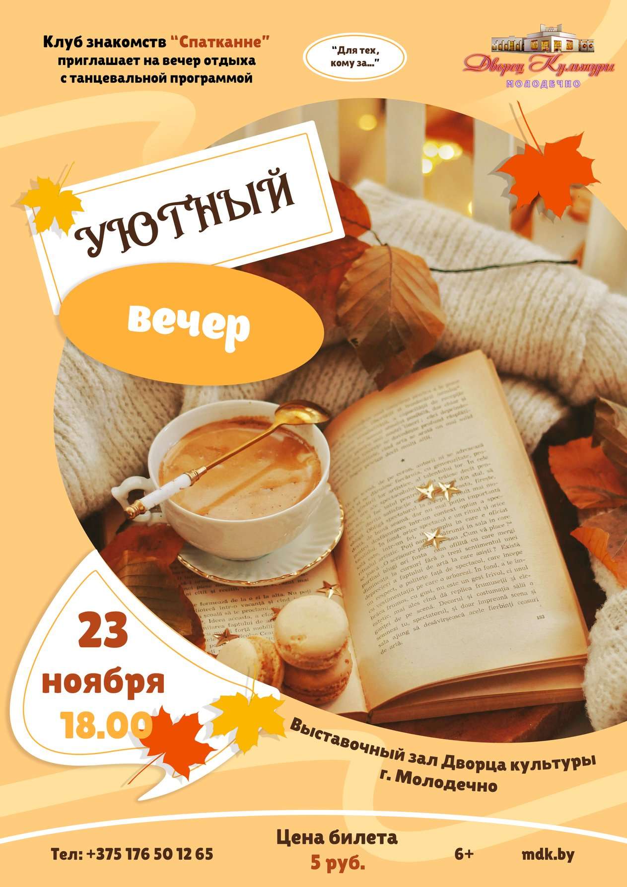 17.11.2025Клуб знакомств «Спатканне» Дворца культуры г. Молодечно приглашает 23 ноября на вечер отдыха с танцевальной программой «Уютный вечер».