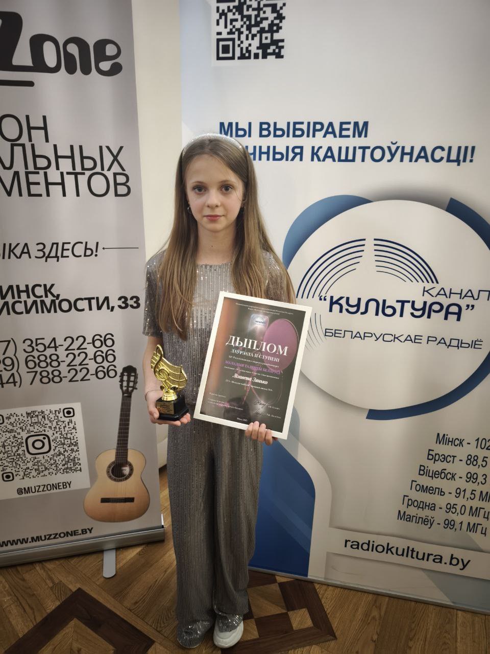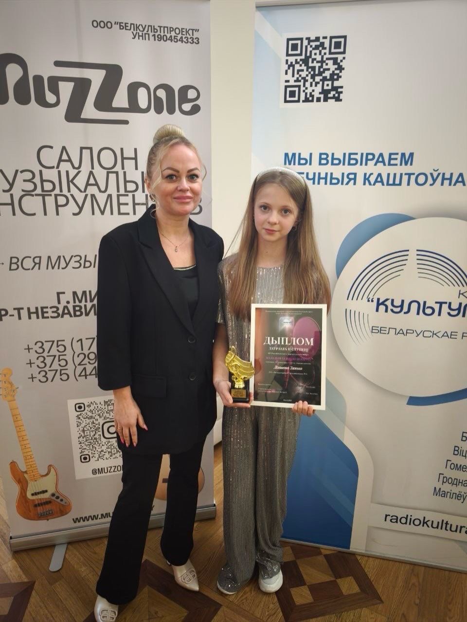 15.12.2025Воспитанница образцовой студии эстрадной песни «Спяваем разам» Дворца культуры г. Молодечно 12-летняя Елизавета Зенько стала лауреатом ІІ степени XIV республиканского творческого радиоконкурса «Маладыя таленты Беларусі». Церемония награждения прошла 14 декабря на сцене Республиканского Дворца культуры профсоюзов в городе Минске. В ней приняли участие и наша Лиза вместе со своим педагогом Александрой Шиман.