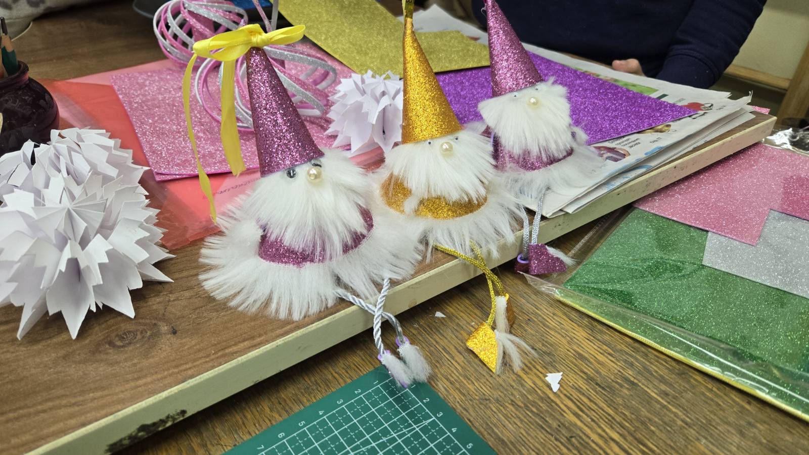 Главными материалами для творчества стали бумага и фоамиран, которые в руках начинающих мастеров превращались в настоящие произведения искусства. Благодаря безграничной фантазии руководителя арт-студии Тамары Марченковой и её участников появились чудесные Деды Морозы, яркие ёлочки, милые гномы и оригинальные игрушки.