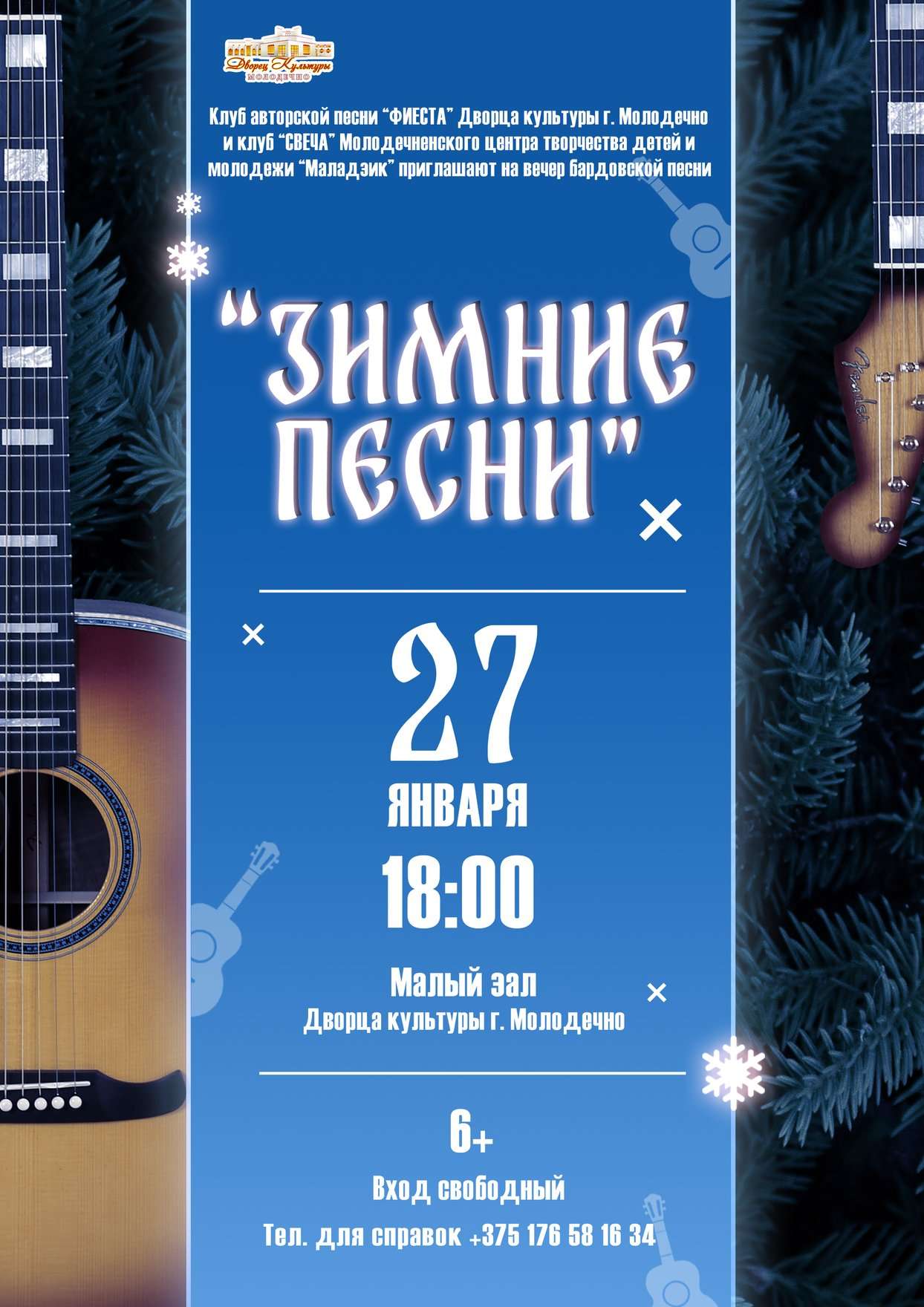 21.01.2026Клуб авторской песни «Фиеста» Дворца культуры г. Молодечно и клуб «Свеча» Молодечненского центра творчества детей и молодёжи «Маладзик» приглашают 27 января любителей бардовского искусства на концертную программу «Зимние песни».