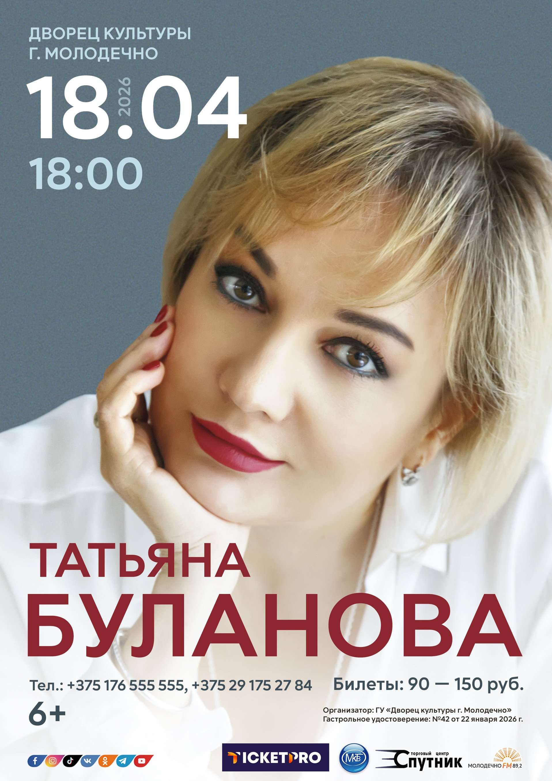 27.01.2026К нам едет Татьяна Буланова! Концертная программа состоится 18 апреля во Дворце культуры г. Молодечно.