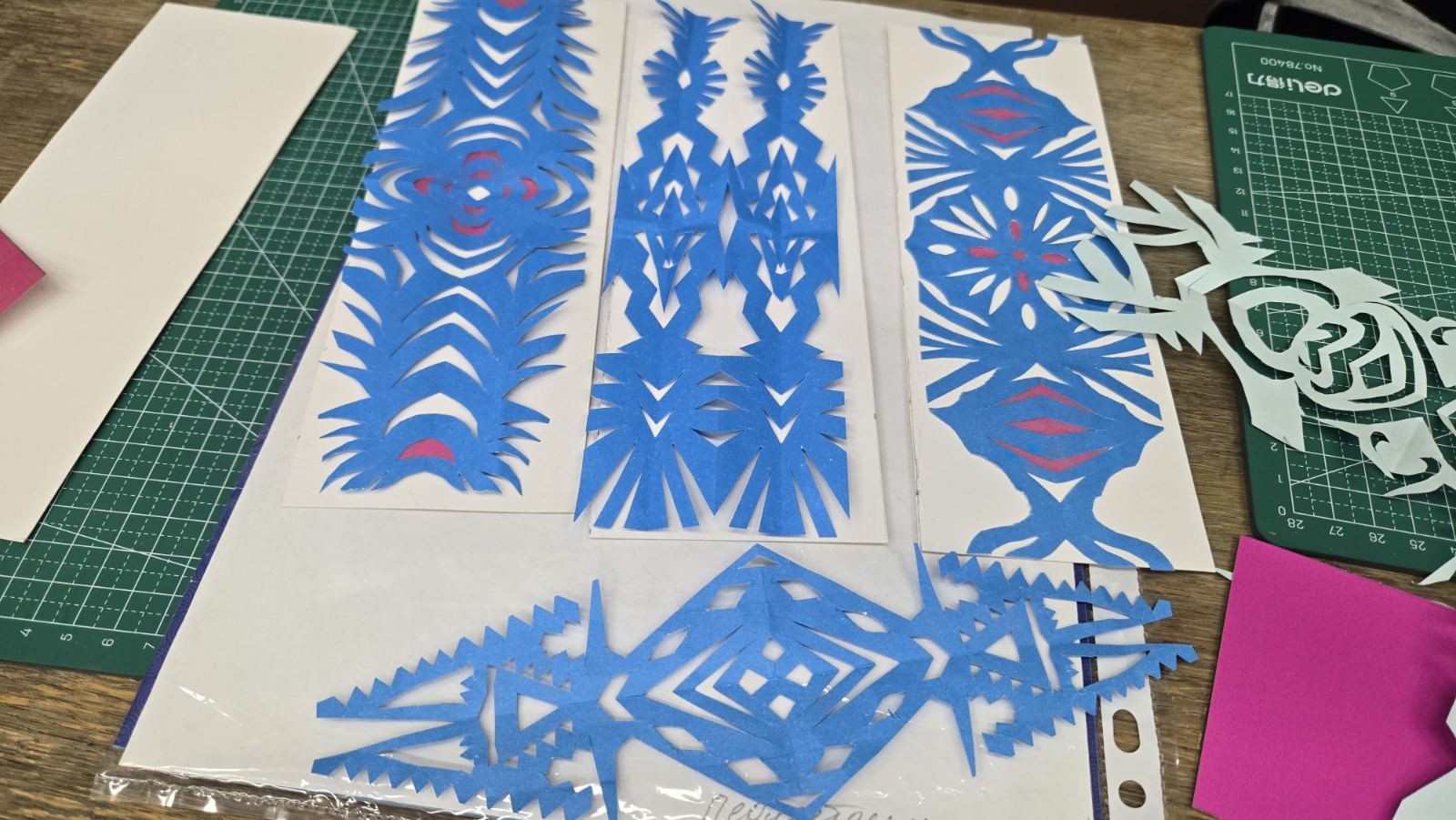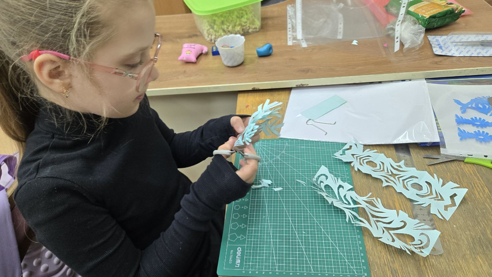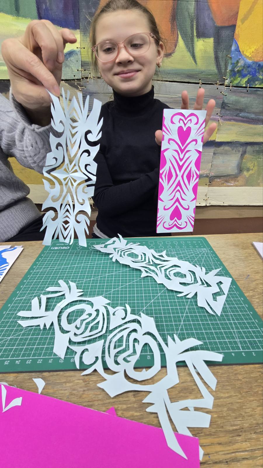 Взрослые участники студии читали сказки, рассказывали рождественские истории, а ребята рисовали снежные пейзажи и мастерили закладки для книг, используя технику вытинанки. Их создание для всех студийцев было очень занятным. В основу каждой закладки легли деликатные узоры, напоминающие морозные рисунки на окнах. Мастера увлечённо вырезали из бумаги ажурные зимние мотивы, превращая обычные листы в произведения искусства.