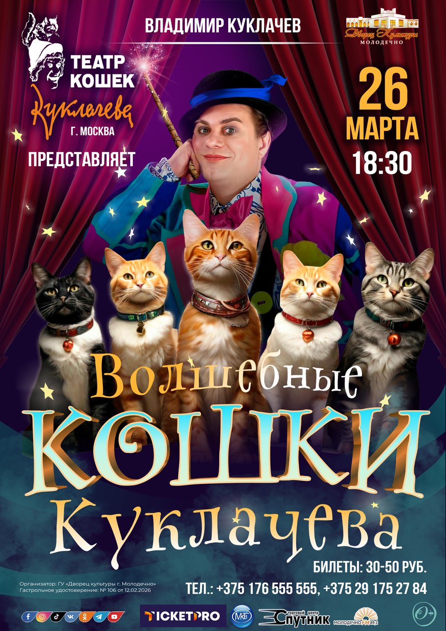 19.02.2026Детский спектакль «Волшебные кошки» с участием Владимира Куклачёва («Театр кошек Куклачёва», г. Москва) пройдёт во Дворце культуры г. Молодечно.