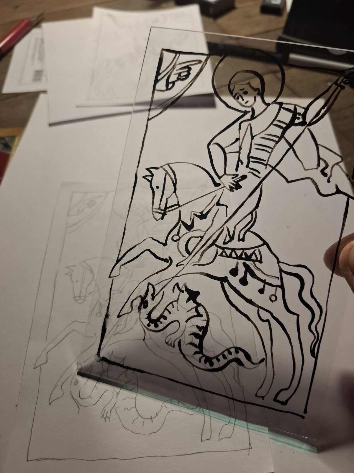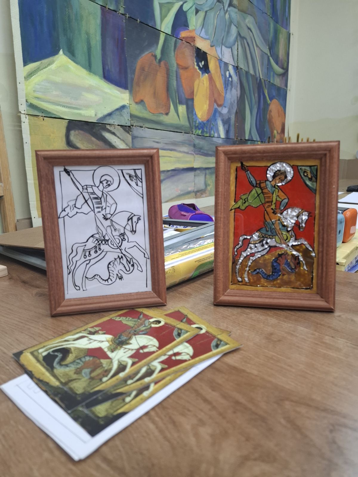 Юные таланты студии с усердием трудились над созданием праздничных открыток, применяя технику живописного рисунка. Старшие участники погрузились в более сложную, но не менее увлекательную задачу. Они делали картину с изображением Георгия Победоносца, взяв за основу древнюю белорусскую технику росписи по стеклу (акварель, гуашь) с добавлением фольги. Святой Георгий Победоносец, как известно, является символом мужества, храбрости и отваги, борца и победителя добра над злом.