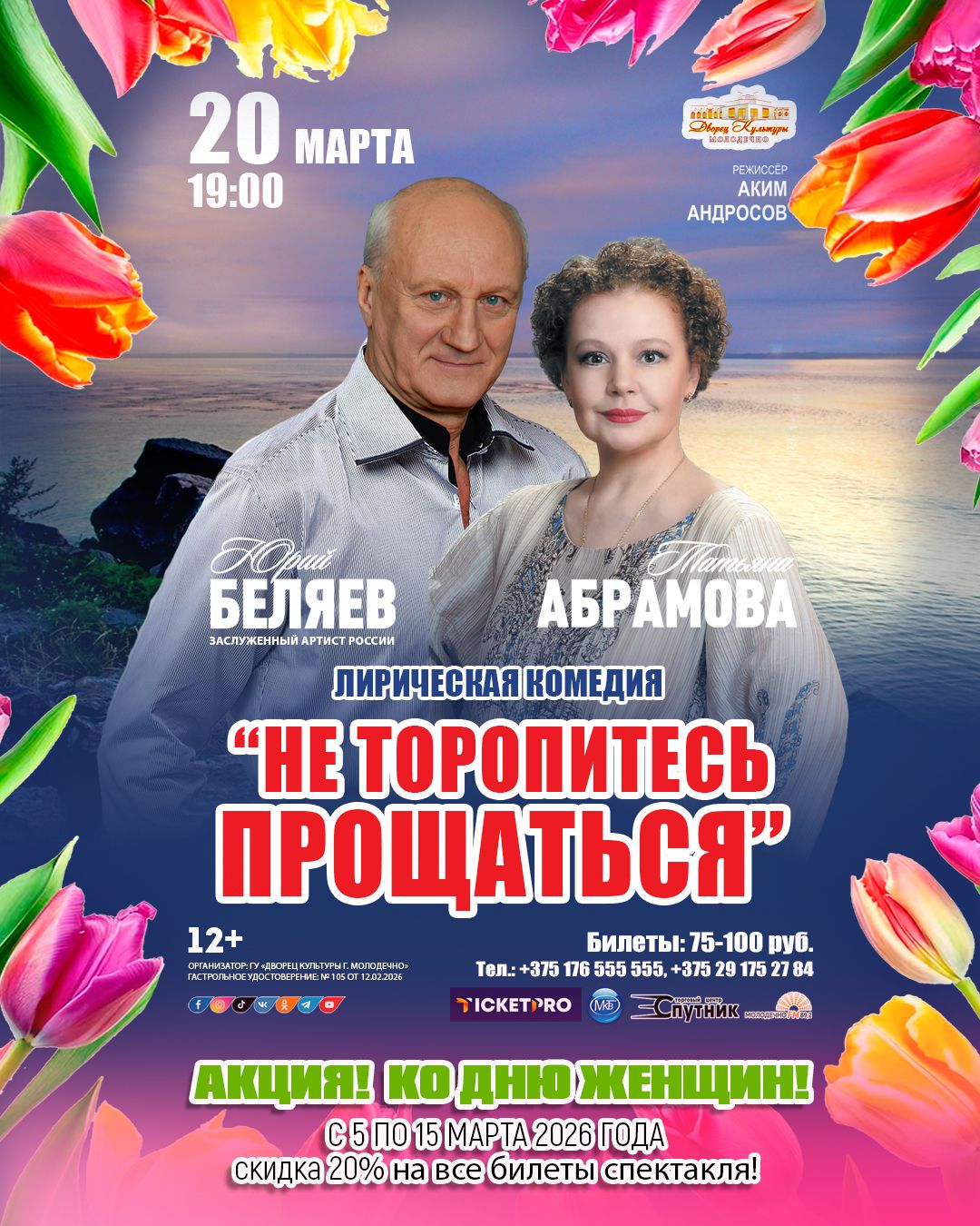 В эти дни у вас есть замечательная возможность приобрести билеты со скидкой 20% на трогательный и вдохновляющий спектакль «Не торопитесь прощаться»! Эта постановка, наполненная искренними эмоциями и глубоким смыслом, состоится в нашем уютном зале 20 марта в 19:00.