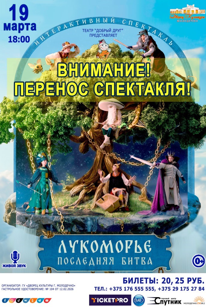 В связи с изменением гастрольного тура, интерактивный спектакль «Лукоморье. Последняя битва» театра «ДОБРЫЙ ДРУГ», запланированный 19 марта 2026 года, ПЕРЕНОСИТСЯ.