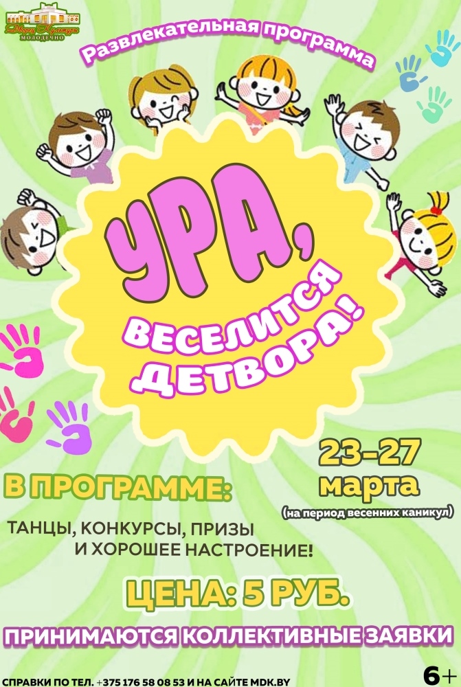 16.03.2026Дворец культуры г. Молодечно приглашает весело и интересно провести время весенних каникул: с 23 по 27 марта отдел по работе с детьми и молодёжью подготовил для учеников начальной школы развлекательную программу «Ура, веселится детвора!»