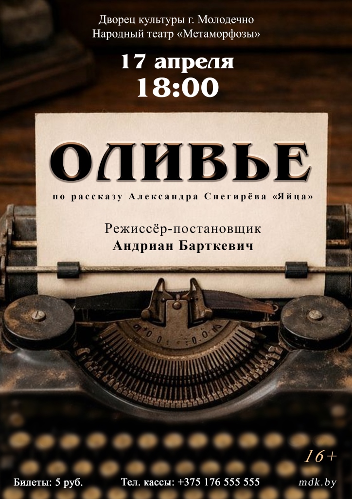 16.03.2026Народный театр «Метаморфозы» Дворца культуры г. Молодечно приглашает 17 апреля на премьерный спектакль «Оливье».