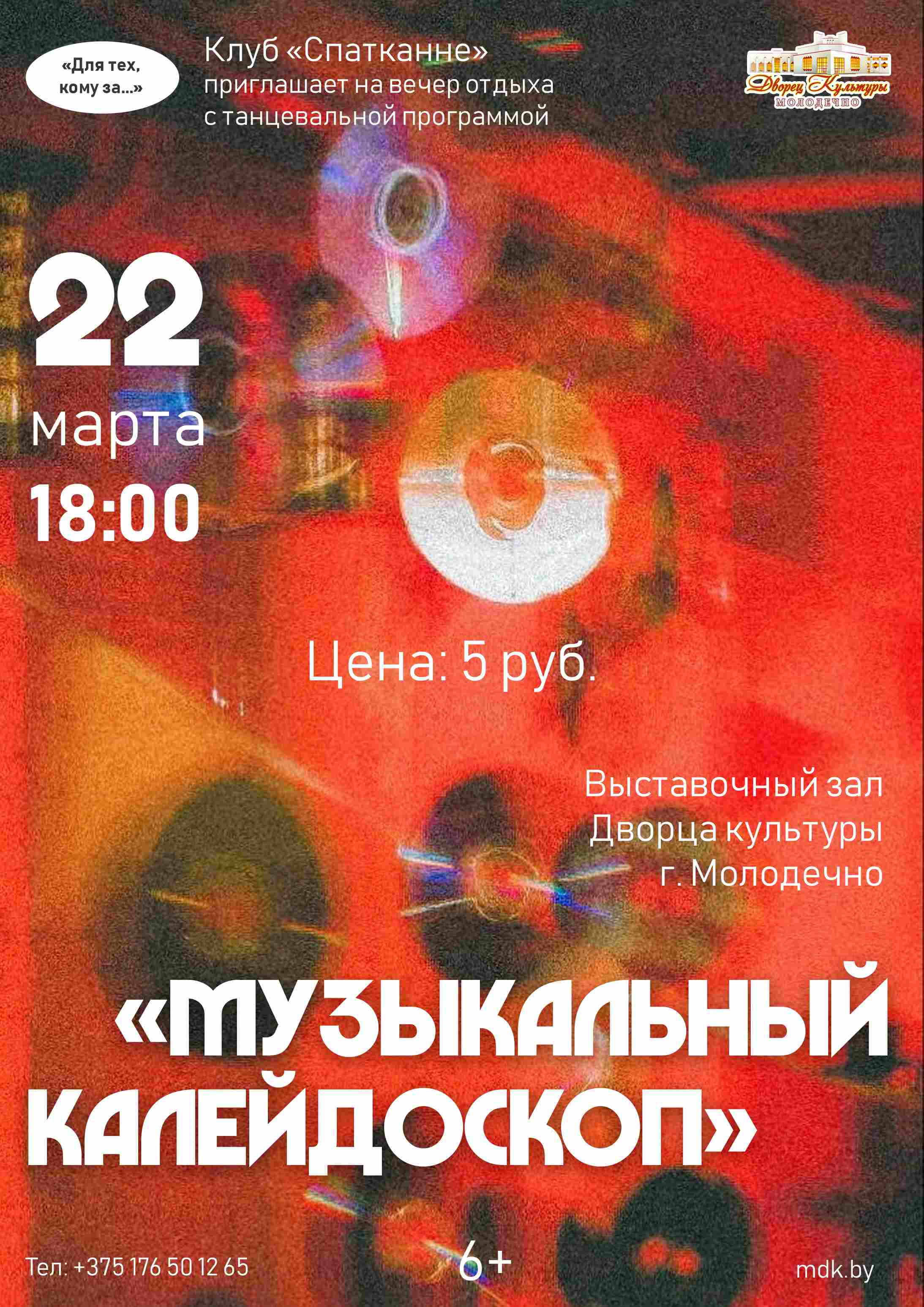 Вас ждёт увлекательное путешествие в мир музыки, наполненное позитивными эмоциями и хорошим настроением. «Музыкальный калейдоскоп» – отличная возможность провести время в кругу друзей, познакомиться с новыми людьми и просто отдохнуть от повседневной суеты. Атмосфера праздника, дружеское общение и, конечно же, танцы – всё это ждёт вас на вечере во Дворце культуры.