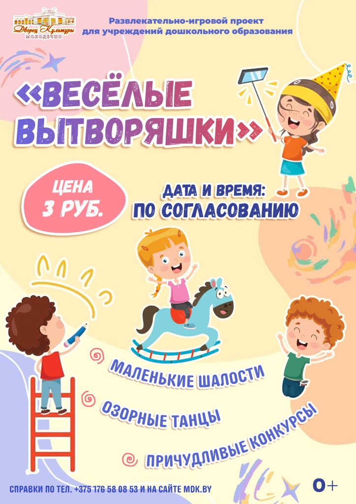 17.03.2026Отдел по работе с детьми и молодежью Дворца культуры г. Молодечно предлагает проведение развлекательно-игрового проекта «Весёлые вытворяшки» д ля воспитанников учреждений дошкольного образования.