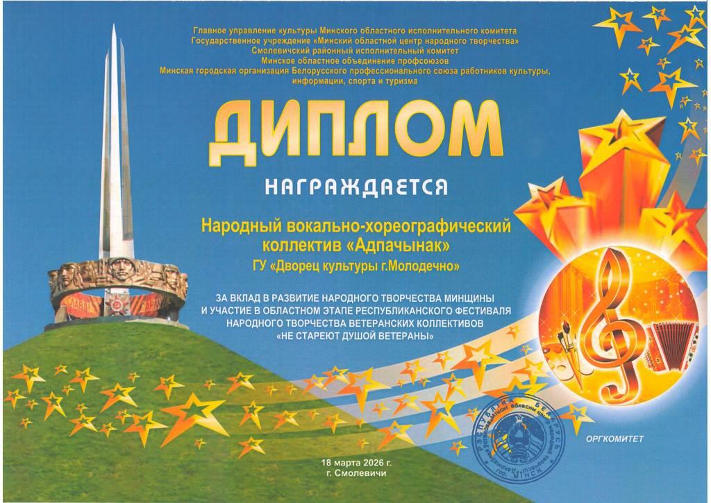 19.03.2026В Смолевичах 18 марта прошел областной этап Республиканского фестиваля народного творчества ветеранских коллективов «Не стареют душой ветераны». Участие в мероприятии приняли вокально-хоровые, хореографические коллективы, ансамбли, вокальные дуэты и индивидуальные исполнители из 23 регионов столичной области. Наш район представил народный вокально-хореографический коллектив «Адпачынак» Дворца культуры г. Молодечно.
