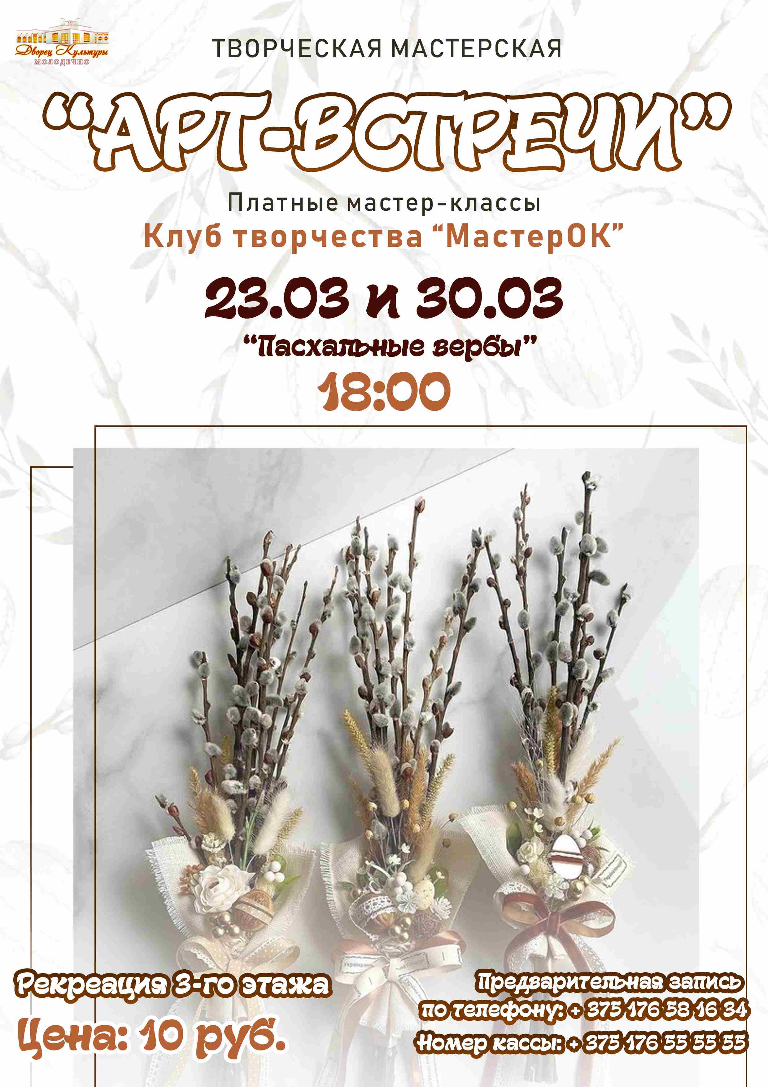 19.03.2026Клуб творчества «МастерОК» Дворца культуры г. Молодечно приглашает всех желающих в мастерскую «АРТ-встречи» на мастер-классы «Пасхальные вербы».