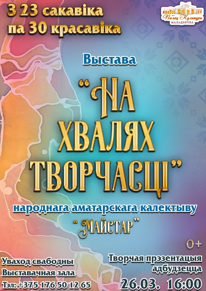 25.03.2026Запрашаем 26 сакавіка на прэзентацыю выставы “На хвалях творчасці” народнага аматарскага калектыву “Майстар” Палаца культуры г. Маладзечна. Пачатак у 16.00. Уваход свабодны.
