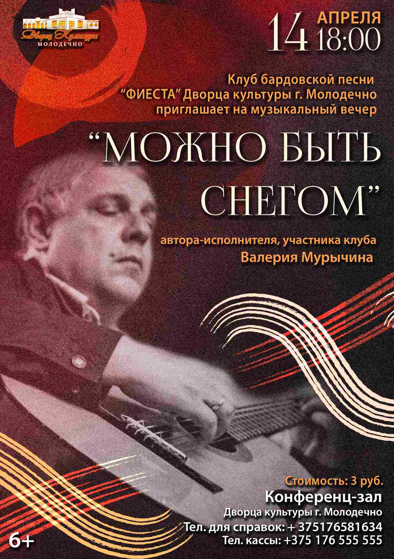 03.04.2026Клуб бардовской песни «Фиеста» Дворца культуры г. Молодечно приглашает 14 апреля на музыкальный вечер «Можно быть снегом».