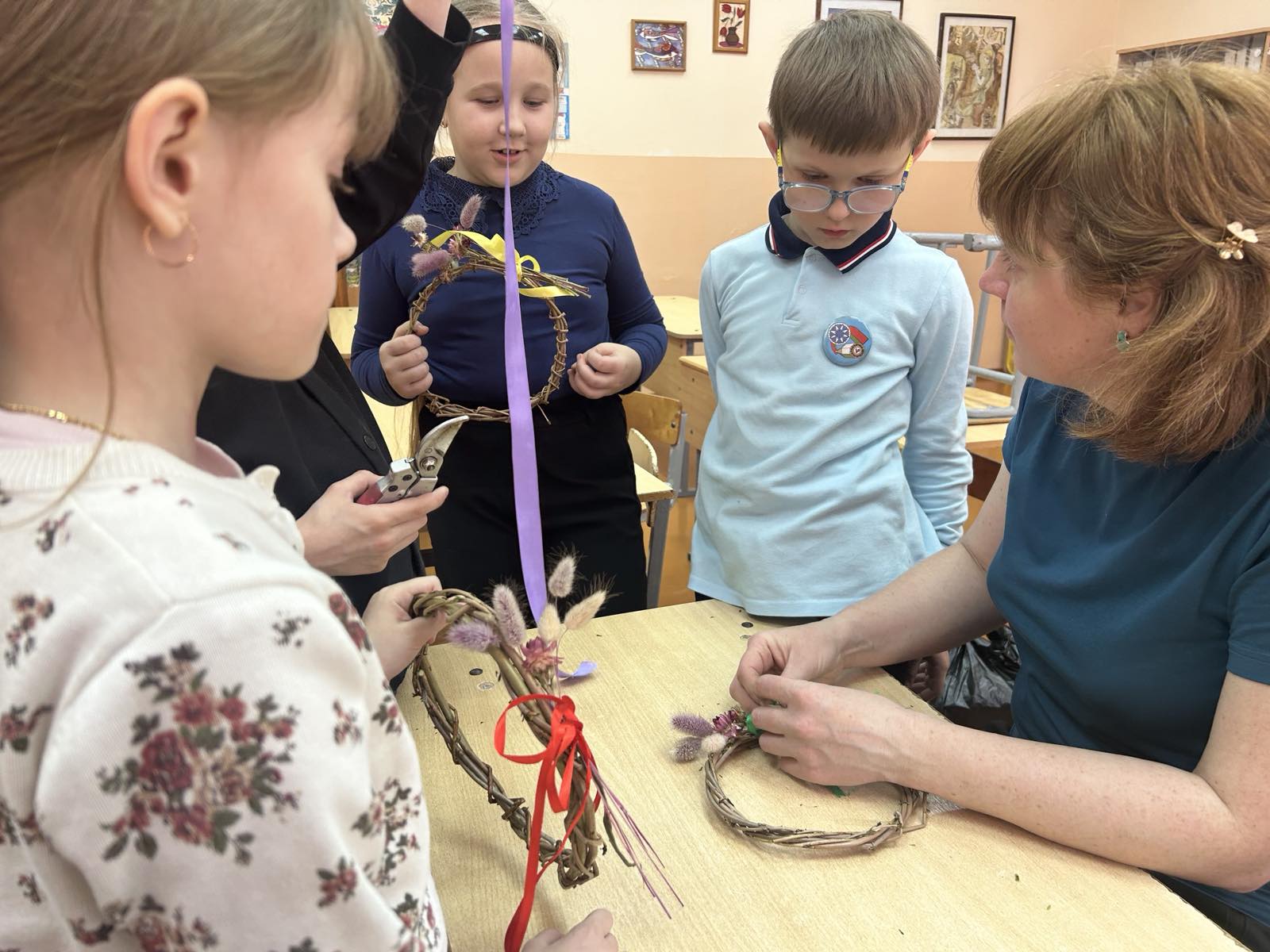За основу для пасхальных шедевров была взята прочная база из гибких ветвей, а затем началось самое интересное – декорирование. Ребята с удовольствием подбирали цветовые сочетания, экспериментировали, делились идеями и помогали друг другу. Особое внимание уделялось деталям: аккуратно прикреплялся каждый элемент декора, изящно располагались яркие ленты и цветочные композиции – всё для того, чтобы придать праздничный акцент. В итоге каждый венок стал уникальным отражением фантазии и умений юных мастеров.