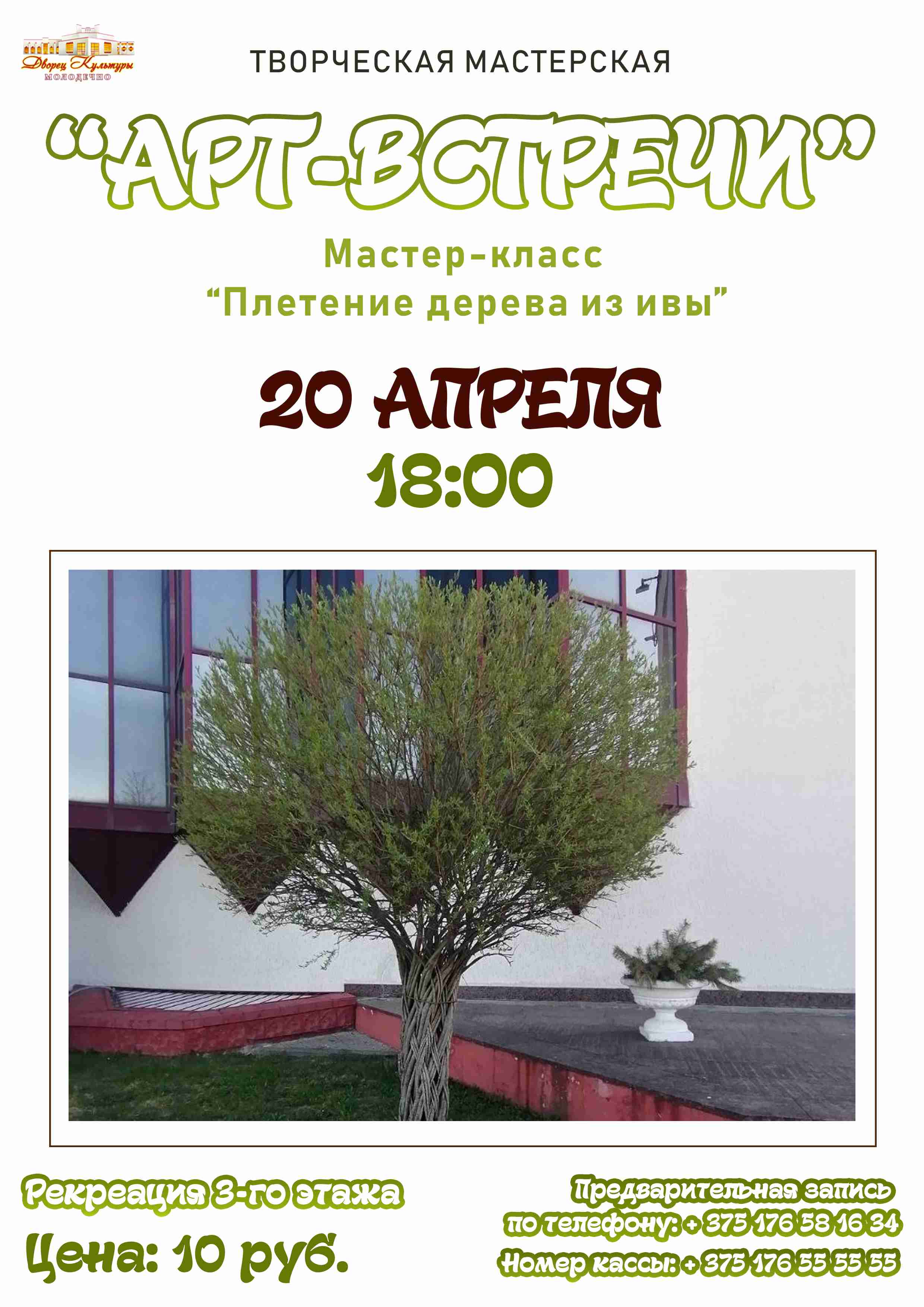 15.04.2026Дворец культуры г. Молодечно приглашает в творческую мастерскую «АРТ-встречи». В её рамках 20 апреля пройдёт мастер-класс «Плетение дерева из ивы».