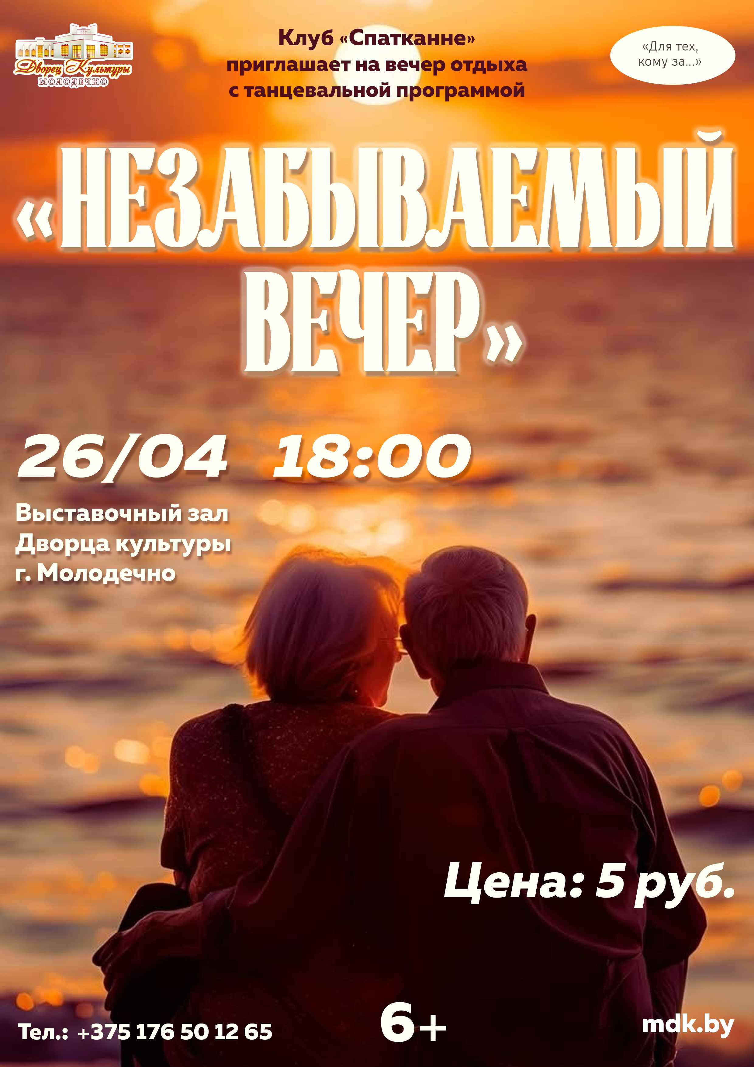 23.04.2026Клуб «Спатканне» Дворца культуры г. Молодечно приглашает 26 апреля на вечер отдыха с танцевальной программой «Незабываемый вечер».